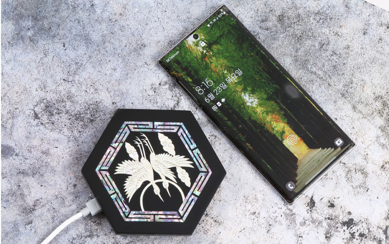 전통적인 나전칠기 방식과 무선충전기를 결합하여 제작한 나전 자개 무선충전기는 애플 iOS, 갤럭시 Android 안드로이드 고속 충전이 가능한 15W 고속 충전 기능이 탑재되어 있습니다.