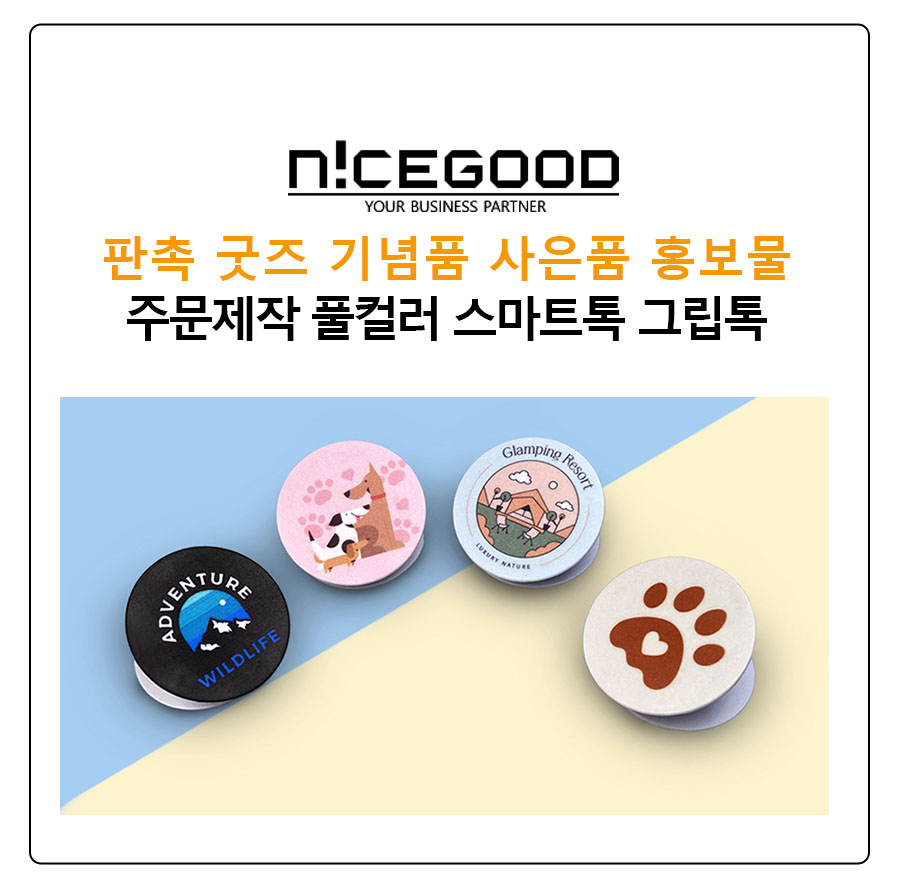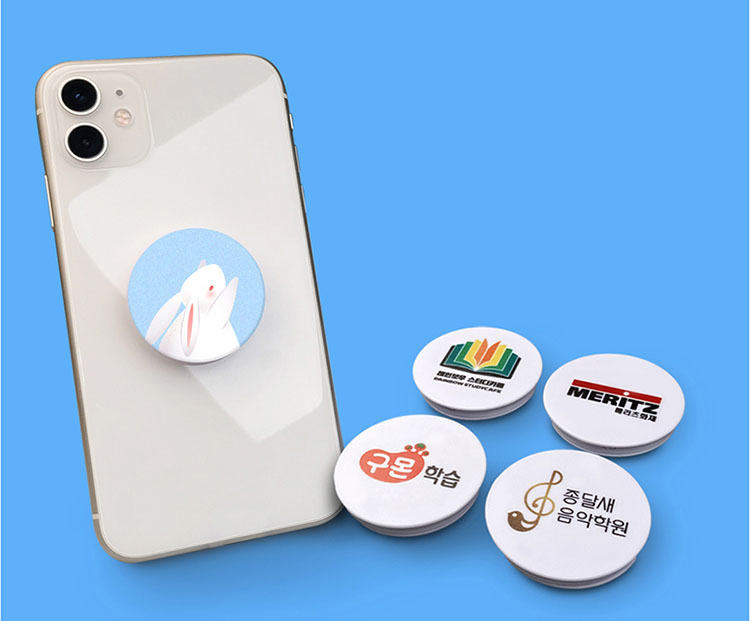 UV 풀컬러 인쇄로 원하는 디자인을 선명하고 깨끗하게 표현 할 수 있고, 넓은 인쇄 면적으로 홍보내용을 충분히 담을 수 있는 점이 특장점으로 인정받고 있는 굿즈 판촉물 기념품 사은품 홍보물 대표 아이템 스마트톡 그립톡