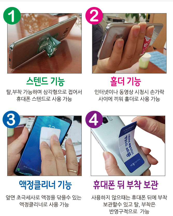 점착메모지(포스트잇)처럼 부착이 되기 때문에 횟수에 관계 없이 계속 반영구적으로 사용이 가능합니다. 스텐드 기능, 홀더 기능,액정클리너 기능을 모두 가지고 있고, 사용하지 않을 때에는 핸드폰에 부착해서 보관이 가능합니다.