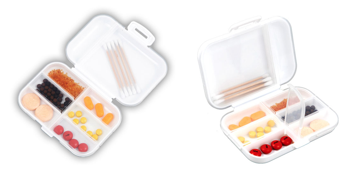 휴대용 사각 약통 케이스는 바닥면에 6개의 수납칸으로 나뉘어져 있고, 뚜껑면에는 소형과 대형으로 분리한 2개의 수납칸으로 나뉘어져 있어 매일 챙겨야하는 약을 보관하고 휴대할 수 있도록 제작되어 있습니다.
