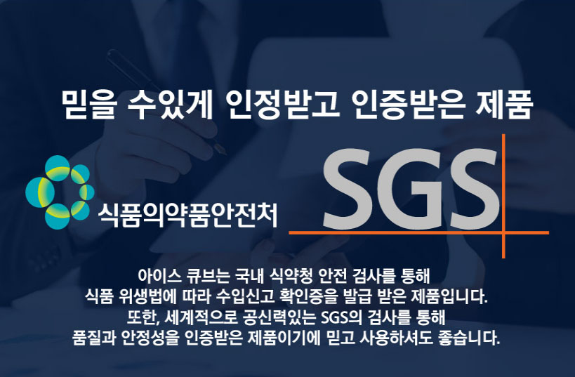 아이스 큐브는 믿을 수 있는 인증 받은 제품으로 식품의약품 안전처 SGS 검사를 통해 품질과 안전성을 인증 받은 제품입니다. 식품 위생법에 따라 수입시고 확인증을 받급 받은 제품입니다.