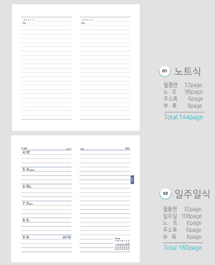 노트식과 다이어리식이 내지 선택이 가능하고 달력 13개월(다음년도 1월까지) 구성되어 있으며 가볍고 슬림해서 휴대성이 뛰어납니다.