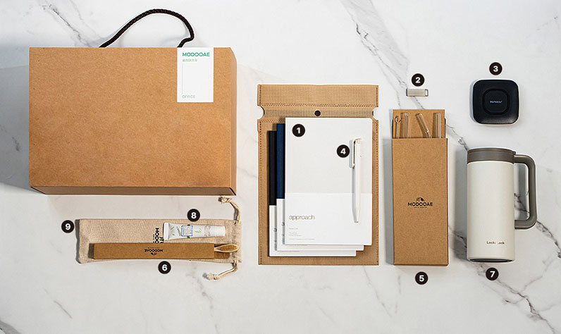 국제 국내 기업 행사 세미나 학회 포럼 웰컴키트 기념 홍보 굿즈는 어프로치 라인드 줄노트, 액센메날 USB메모리 32GB, 스피디 이지 15W 고속무선충전패드, 독일산 세나토 항균가공볼펜, 유리빨대 4종(세척솔 포함), 친환경 대나무칫솔, 락앤락 테이블머그 텀블러, 플라무 EM치약, 빨대와 양치세트 보관을 위한 린넨파우치 총 9종으로 구성된 웰컴키트입니다.