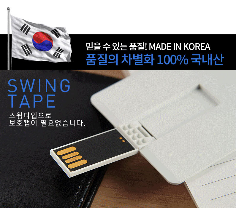 믿을 수 있는 품질의 국산제품으로 커버와 메모리칩이 스윙타입으로 개폐가 가능해서 보호캡이 필요 없고, 살짝 들어올리기만 하면 바로 사용이 가능해서 보호캡 분실이나 작은 사이즈로 인한 제품 분실 등을 방지할 수 있습니다.