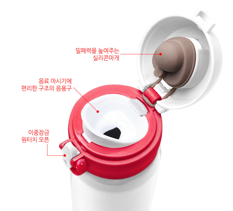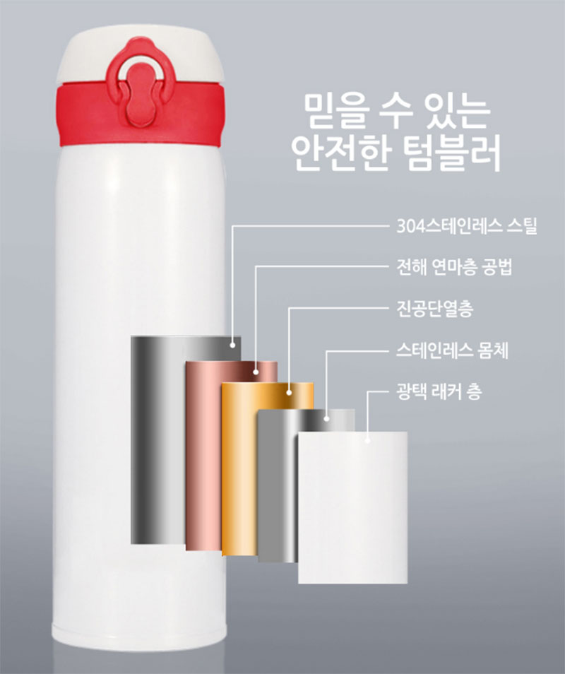 스벅텀블러 450ml 사용상의 편의와 함께 텀블러의 기본 기능에 충실한 구조로, 앞에서 안내 드린 바와 같이 내부는 304 최고급 스테인리스 사용과 함께 전해연마층 공법, 진공단열층, 스테인리스 몸체와 광택 래커 층으로 구성되어 있어 보온보냉효과와 견고함 모두 우수한 원터치 텀블러입니다.