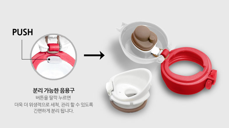 위생과 안전에 가장 민감한 부분인 음용구의 경우, 버튼 한 번으로 추가 분리가 가능해서 더욱 위생적으로 세척 관리가 가능합니다.
