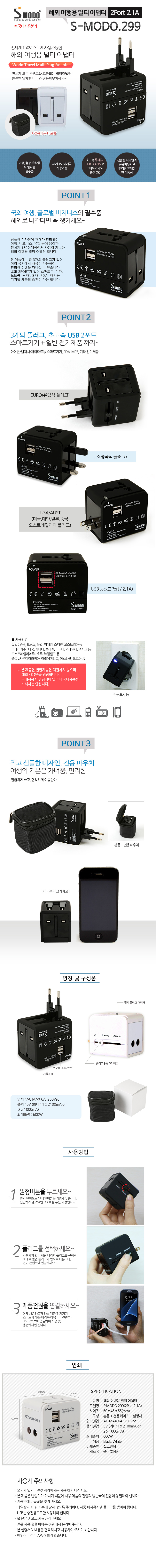 [SMODO-299] 해외 여행용 멀티 어댑터 3플러그(2포트 2.1A)는