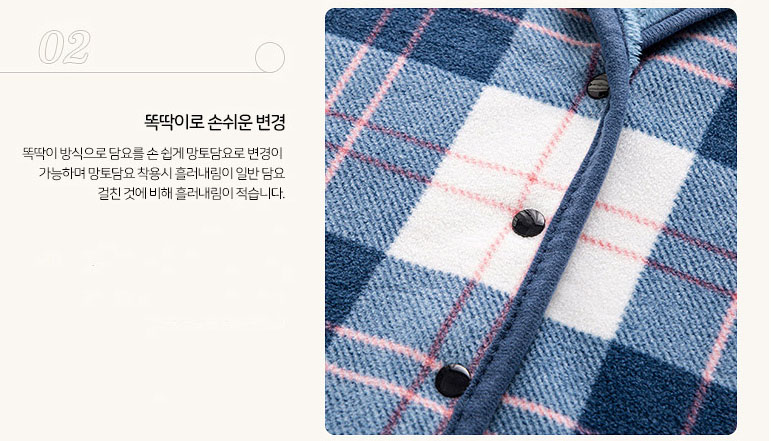 똑딱이 방식으로 무릎담요를 간편하게 망토담요로 바꿀 수 있고, 망토담요 착용 시 일반 담요에 비해 흘러내림이 적어 뛰어난 활동성을 보장합니다.