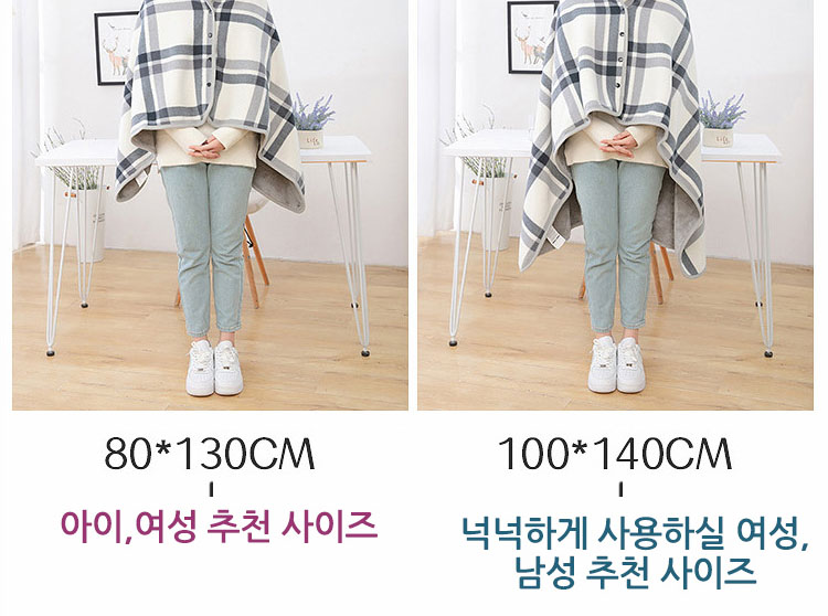 80X130Cm의 중형 망토 무릎담요는 어깨에서 엉덩이까지 커버가 되며, 100X140Cm의 대형 사이즈는 어깨부터 허벅지까지 감싸주어 남여 구분 없이 충분한 보온효과를 기대할 수 있습니다.