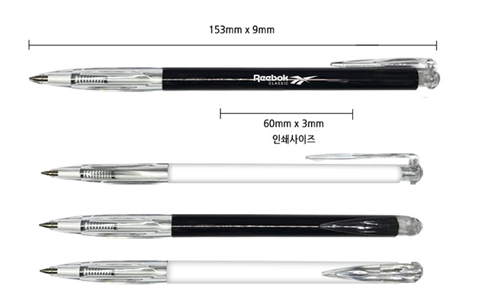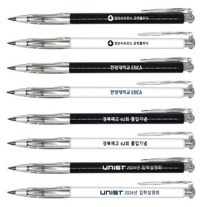 투명한 노크식(눌러서 펜을 사용하는 방식) 클립과 오랜 필기에도 손가락이 편안하도록 설계된 삼각형 모양의 그립, 저점도 니들심으로 필기감을 극대화한 볼펜으로 구성되어 있으며, 깔끔한 블랙 화이트 색상으로 인쇄 시 시인성을 높혀 광고 홍보 효과 또한 뛰어난 디자인입니다.