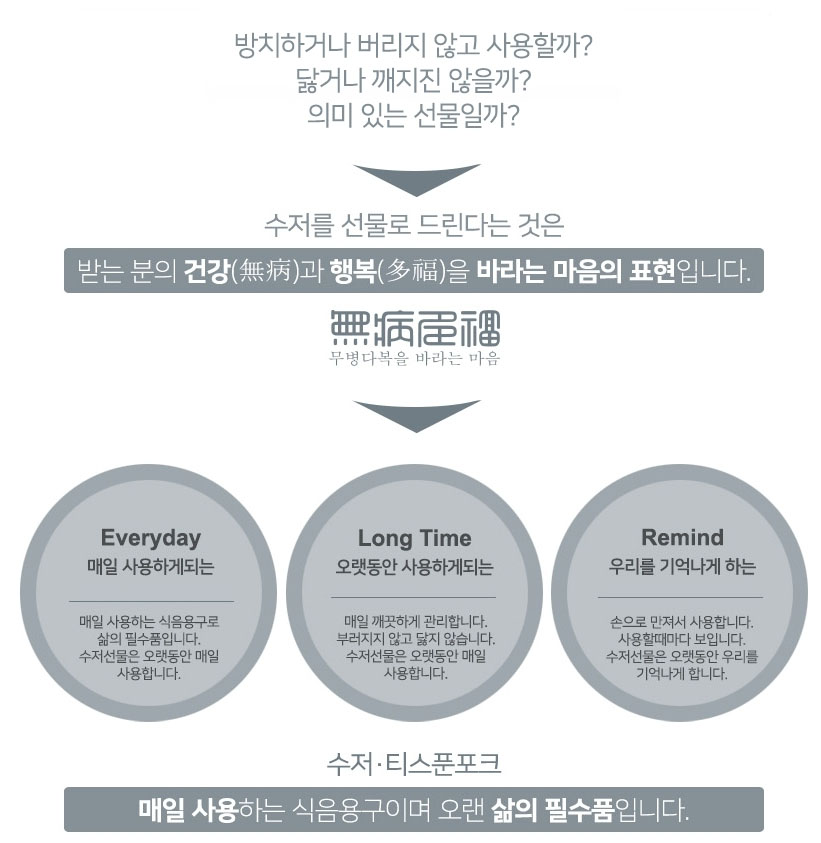 식생활에 사용되는 수저, 포크의 경우 매일 사용하는 식음용 도구로, 각인과 선물포장 등으로 의미를 담아 선물을 하실 경우 받으시는 분의 건강과 행복을 기원하는 마음을 매일 전달할 수 있어, 감사의 표현으로는 최고의 선물이 아닐까 합니다.