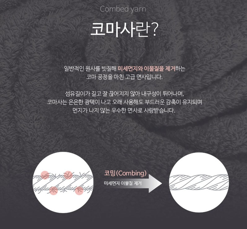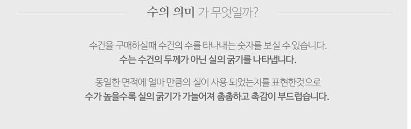 섬유제품의 경우 10수, 20수, 30수, 40수 등 실의 두께를 표현하는 단위가 부여됩니다. 숫자가 높을 수록 가늘고 촘촘한 공정이라 부드러운 촉감을 유지할 수 있습니다.