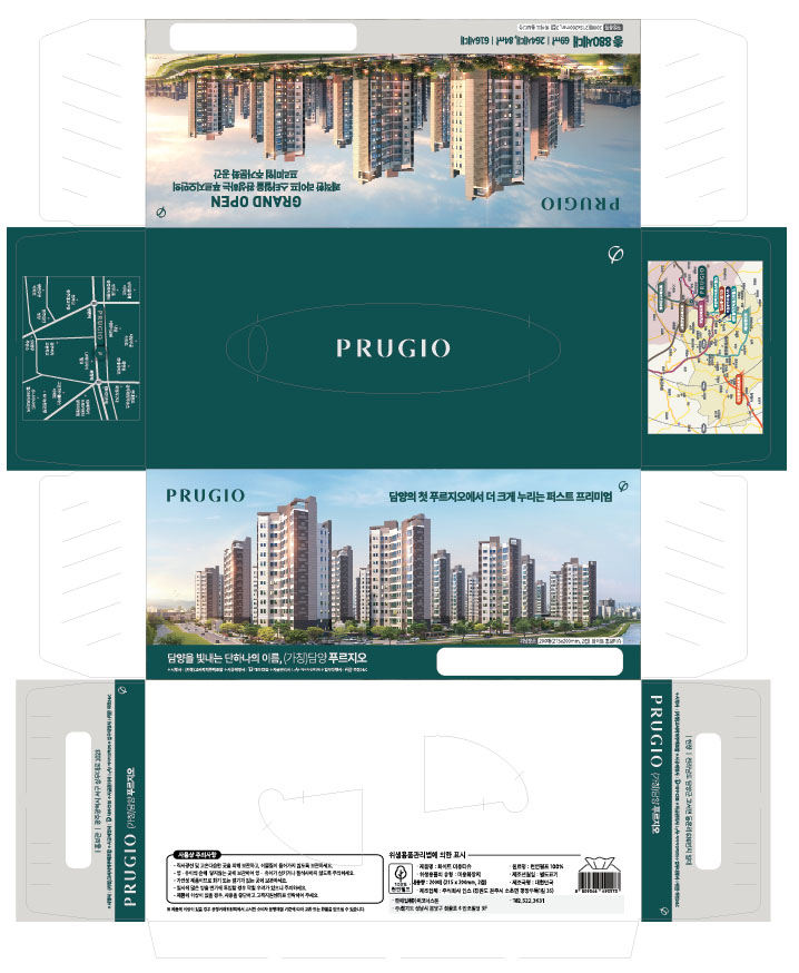 아파트분양 홍보용 각티슈 갑티슈 인쇄 담양 푸르지오 건의 경우 보시는 바와 같이 바닥면을 제외한 7개 면을 모두 활용해서 촘촘하게 아파트 분양 홍보내용을 채웠고, 관공서 민원실이나 카페, 일반 매장 등에 홍보용을 배포해서 큰 효과를 볼 수 있고, 방문객 사은품으로 제공을 겸할 수 있었습니다.