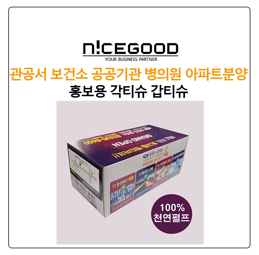 관공서 보건소 공공기관 병의원 아파트분양 홍보용 각티슈 갑티슈 제품 제작 사례와 같이 아파트분양 홍보에는 단골 아이템이지만, 오른쪽과 같이 공공기관, 관공서 등의 홍보물품으로도 제작이 되면 매우 효과적인 결과를 얻으실 수 있습니다.