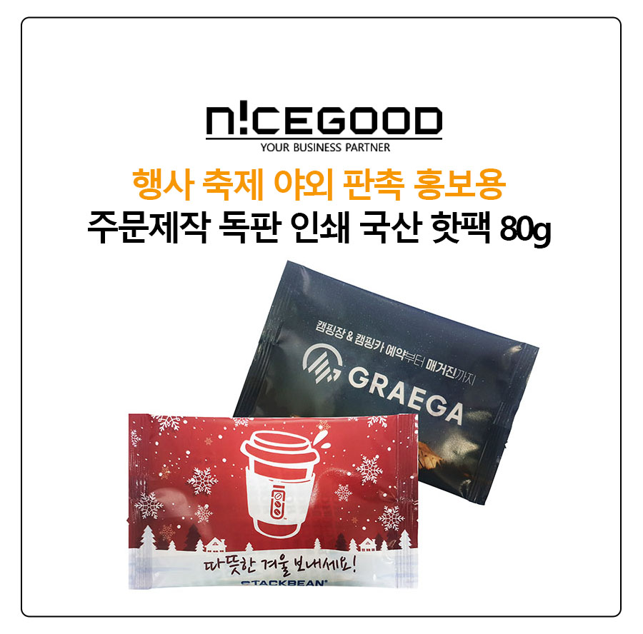 행사 축제 야외 판촉 홍보용 주문제작 독판 인쇄 국산 핫팩은 독판 인쇄형 제품으로 3,000개부터 제작이 가능하며 전문적인 디자인 기술이 없는 고객사를 위해 원하시는 내용을 나이스굿에서 직접 디자인 작업을 해드립니다.