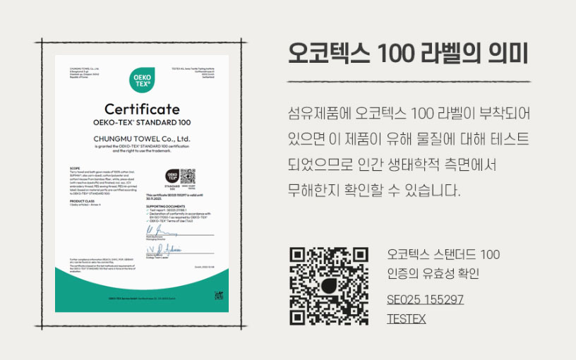 공공기관 산학협력단 단체 기념 홍보물 무형광 무표백 오가닉 타월 안전성을 인증하는 오코텍스 1등급 제품으로, 유아 및 3세미만 영아에도 안심하고 사용하실 수 있습니다.