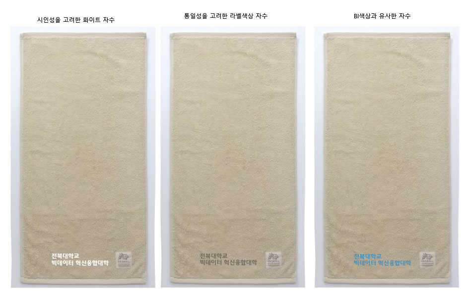 전북대학교 산학협력단 단체 기념 홍보물 무형광 무표백 오가닉 타월의 자수는 늘 그렇듯이 가장 잘 어울리는 색상 또는 시인성에 포커스를 둔 색상 그리고 단체 이미지와 통일되는 색상 등 여러 시안을 드렸고, 최종 중앙의 그레이톤으로 결정을 해주셨습니다.