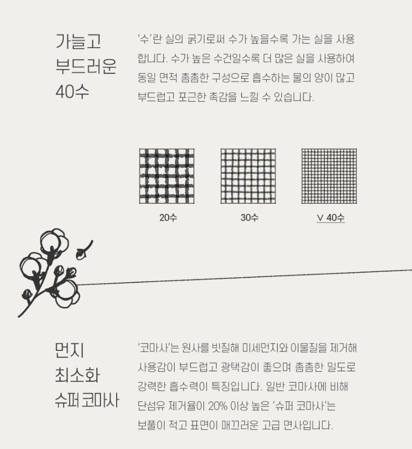 40수 코마사 원단 중에서도 최상급 원단인 슈퍼코마사 원단으로 미세먼지와 이물질로부터 최상의 컨디션을 유지할 수 있고 촘촘한 밀도로 강력한 흡수력을 자랑하며 일반 40수 코마사에 비해 단섬유 제거율이 20%이상 높아 보풀이 적고 표면이 매우 매끄러운 소재입니다.