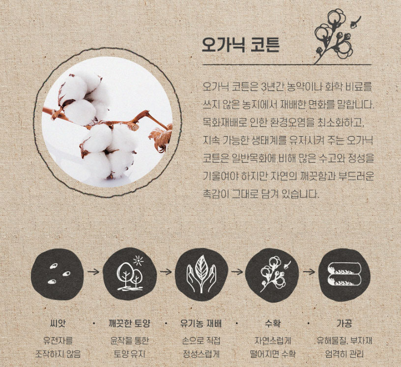 일반 목화에 비해 많은 수고와 정성을 기울여야 하지만, 자연의 깨끗함과 부드러운 촉감이 그대로 녹여져 있습니다.