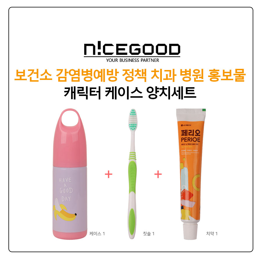 보건소 감염병예방 정책 치과 병원 홍보물 캐릭터 케이스 양치세트는 서울 영등포구보건소에서 세트 상품으로 의뢰를 주셨으나, 세트구성 판매 중단 후 재고가 소진되어 진행이 불가한 상황에서 나이스굿의 업력을 발휘해 케이스와 칫솔치약세트의 재고를 각각 따로 확보해서 진행해드린 건입니다.
