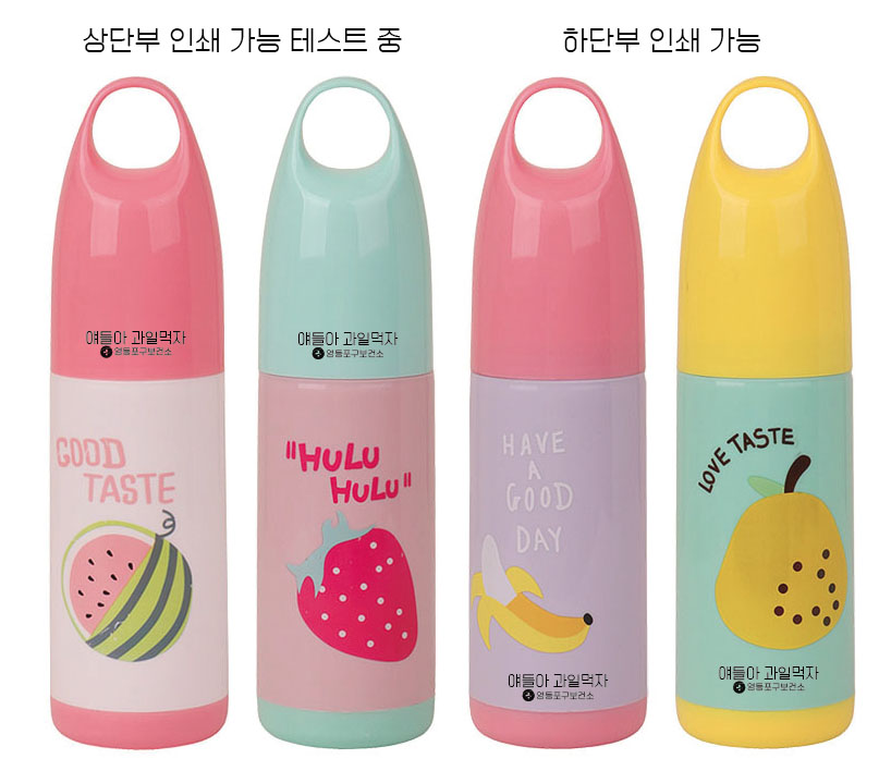 과일 캐릭터 양치 케이스의 경우 원통형의 곡면으로 이루어져 있어, 곡면인쇄에 대한 숙련도가 떨어질 경우 인쇄 품질이 떨어지거나 인쇄사이즈를 임의로 줄여버리기 때문에 전문 인쇄소에서 별도로 진행하게 됩니다.