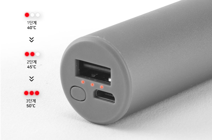 홍보 기념 판촉 답례 굿즈 사은품 미니 서클스틱 손난로 보조배터리 디자인의 또다른 장점이라면 버튼 하나로 최대 50도까지 발열 조절이 가능하며, 40도 45도, 50도까지 총 3단계로 발열 조절이 된다는 것입니다.