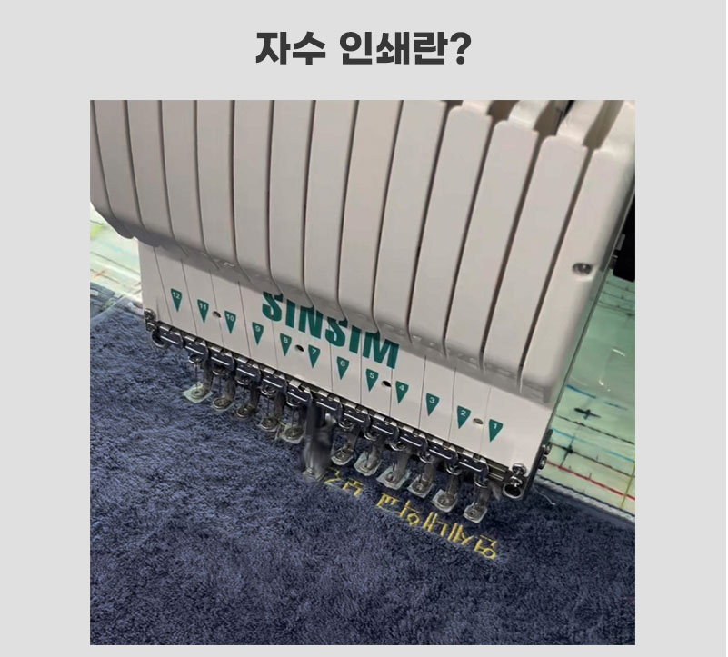 자수인쇄는 원하는 문구, 그림, 로고 등을 컴퓨터 자수 기기로 표현하는 방식으로, 자수용 실을 제품에 그대로 재봉하기 때문에 내용에 따라 또는 글자 수에 따라 단가가 변동될 수 있습니다.