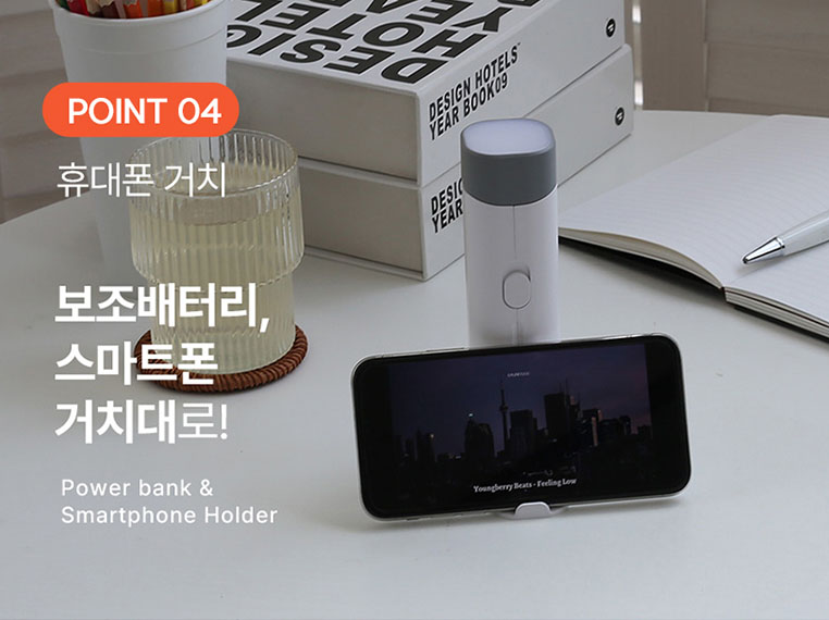 전원을 사용하지 않거나 스마트기기 충전을 하실 때는 탈착이 가능한 받침대에 적용된 거치대 기능을 사용할 수 있어 어떠한 사용환경에서도 다기능 아이템의 효과를 누리실 수 있습니다.