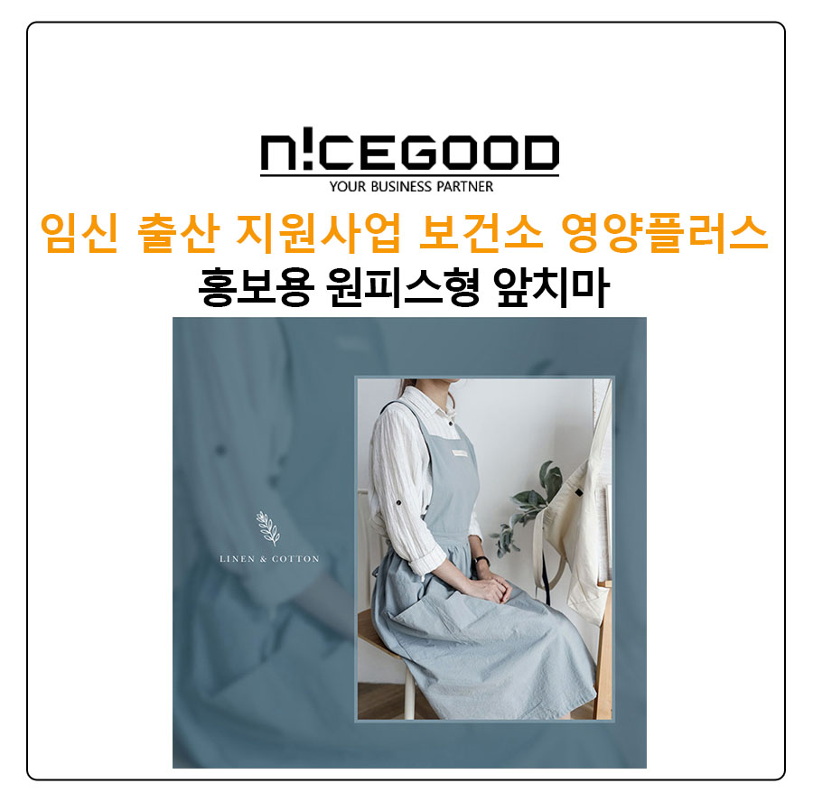 임신 출산 지원사업 보건소 영양플러스 홍보용 원피스형 앞치마 디자인은 전체적으로 살짝 루즈한 유럽감성 디자인이 적용되었으며, 상체 부분 전면에 실크스크린 인쇄도 가능하지만, 따로 인쇄는 요청하지 않으셔서 제품만 출고했습니다.