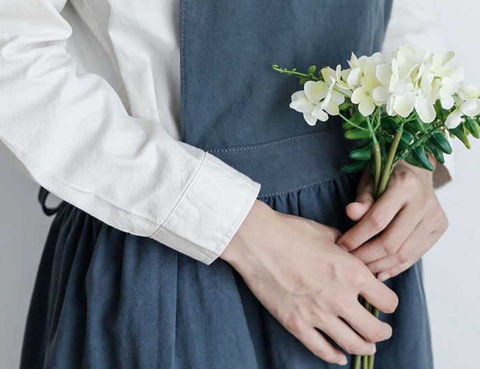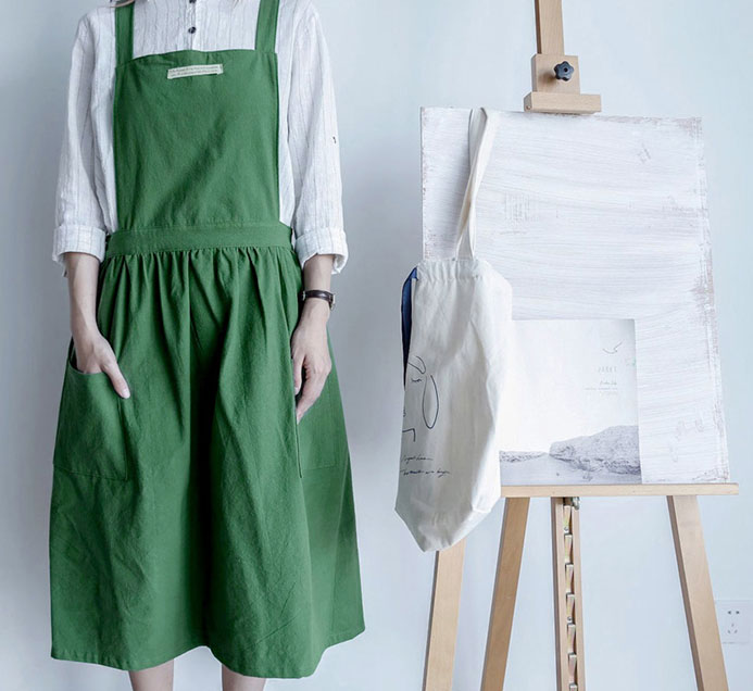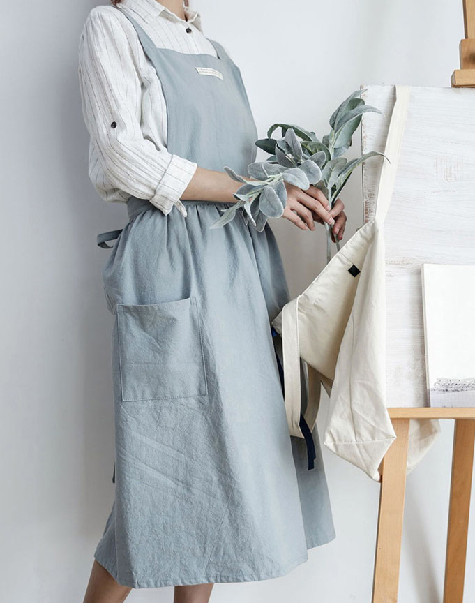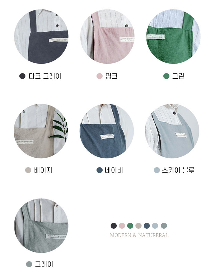 홍보용 원피형 앞치마의 전체적인 디자인의 특징은 봉재 부분의 스티치를 대부분 살려 놓은 느낌이 뉴트럴한 색감과 자연 구김 원단에 잘 묻어 자연스럽고 편안한 분위기를 연출합니다.