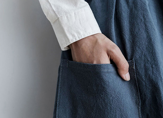 홍보용 원피스형 앞치마의 주머니는 넉넉하고 질긴 마감으로 실이 그대로 보이는 패턴을 적용한 클래시컬한 분위기를 연출합니다.
