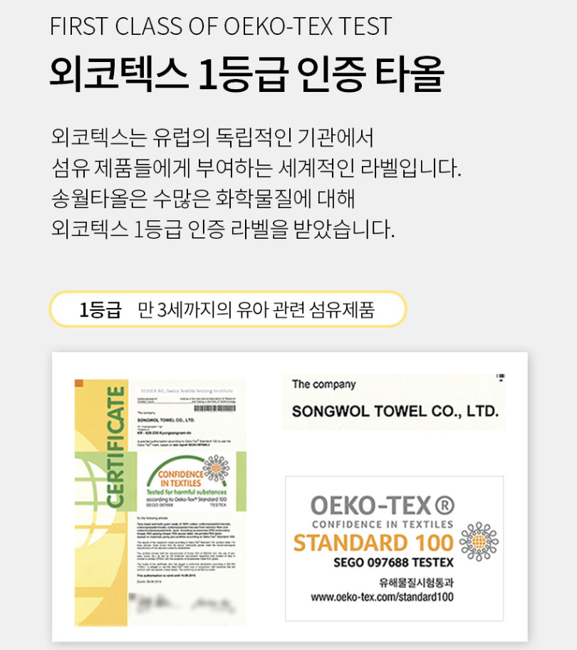 유럽의 독립적인 기관에서 섬유 제품들에게 부여하는 세계적인 라벨 외코텍스 1등급 인증 라벨로 유아에게도 안심하고 사용할 수 있는 친환경 타월입니다.