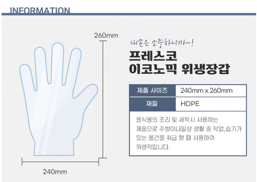 알뜰 실속 가성비 명절 설날 겨울 2천원대 홍보용 주방용품 선물세트 구성에 포함된 위생장갑 30장은 별도 기본박스에 포장이 되어 있으며 240mmX260mm의 사이즈, HDPE[High Density Polyethylene] 재질로 제작되었습니다.