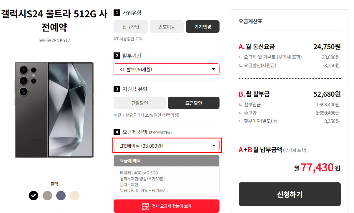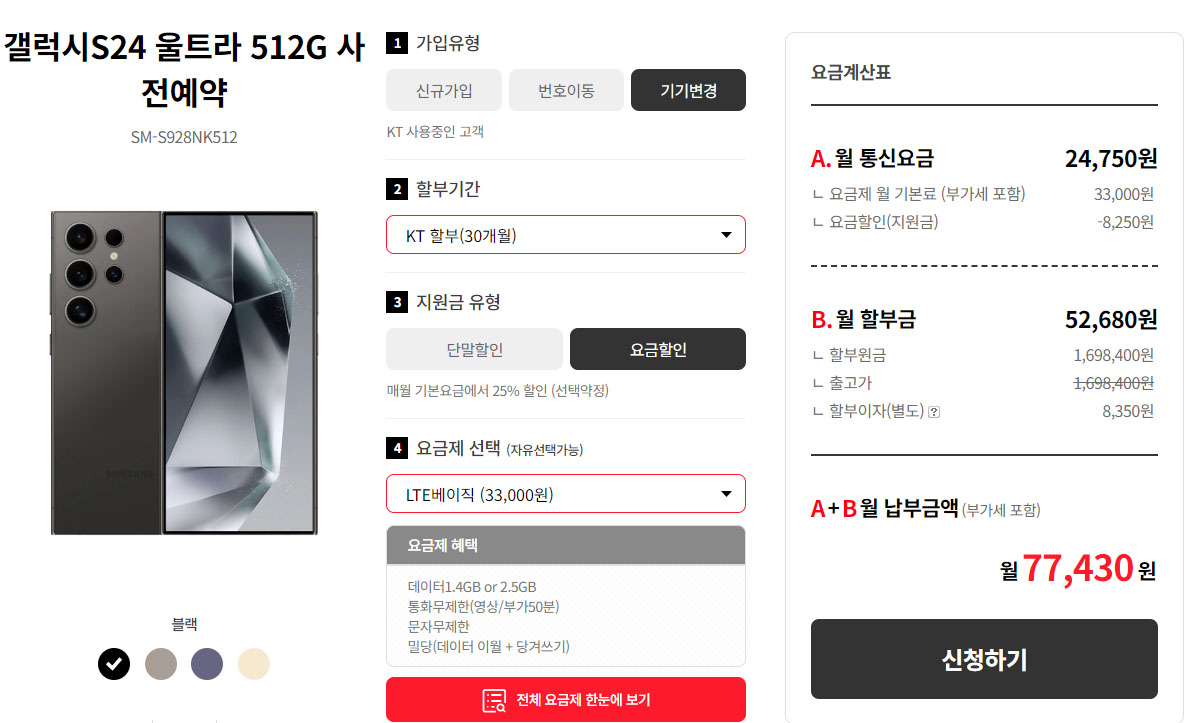 갤럭시 S24 울트라 사전예약 완료, 월부담 납입금 최소화 기기값 추가할인으로 25만원을 선택하면 최초 옵션대비 77,430-8,333=69097원으로 월 납입금은 요금과 할부금 포함 69,000원이 됩니다.