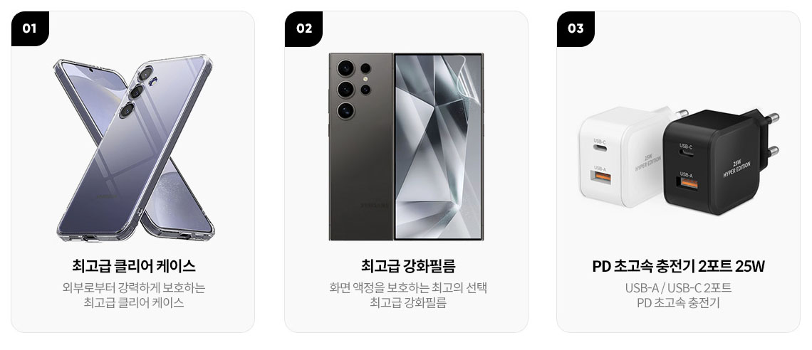 일단 기본 사은품은 투명케이스, 강화필름, 초고속 충전기 2포트가 모든 고객에게 지급이 됩니다.