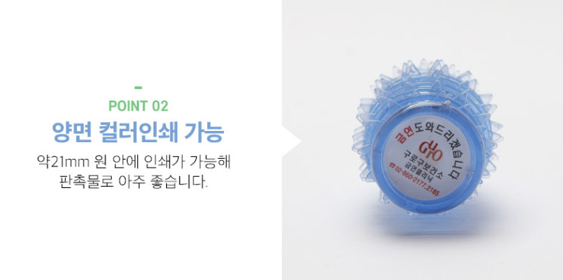 홍보용 손지압기의 인쇄는 양변에 원형으로 스티커를 부착 후 투명한 자체 커버를 다시 부착하는 방식이라, 고온이나 물에 오래 담그지만 않으면 반영구적으로 인쇄 내용이 유지가 됩니다. 다만 직사광선에 장시간 장기간 노출될 경우 빛이 바랄 수 있다는 점도 참고 하시기 바랍니다.