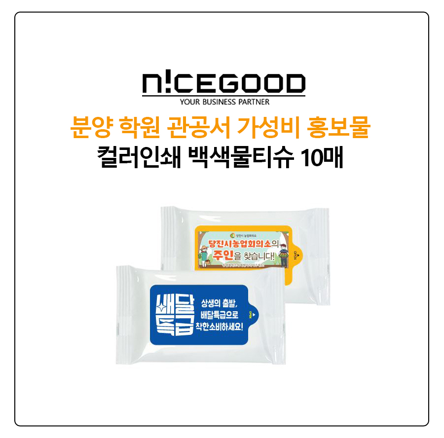 분양 학원 관공서 가성비 홍보물 컬러인쇄 백색물티슈 10매는 아파트분양 판촉 홍보, 학원 홍보, 교회, 관공서 정책홍보, 개업답례품 등으로 꾸준하게 제작 납품되고 있으며, 증정 대상이 광범위하고 저렴한 예산으로 많은 대상에게 홍보를 해야할 필요가 있을 경우에 적합한 아이템입니다.