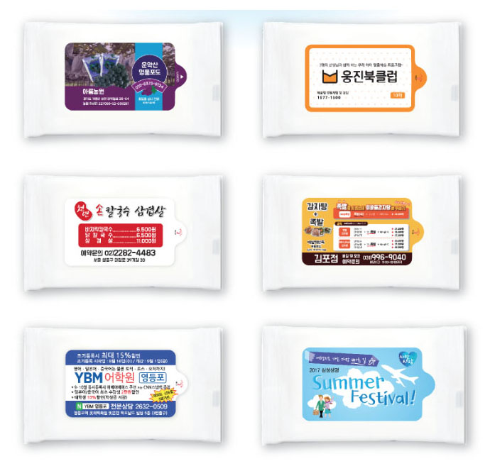 가성비 홍보용 물티슈는 위의 인쇄 예시와 같이 구매사은품이나 학원, 식당, 금융업 등의 홍보나 지자체, 관공서의 정책홍보용으로도 주문이 꾸준하게 이어져 오는 인기 홍보 판촉 아이템입니다.