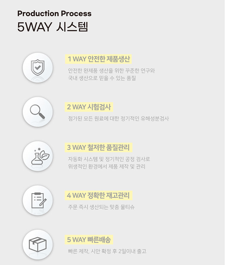 기성품이 아닌 주문 접수 후 디자인을 거쳐 국내에서 제작하는 믿을 수 있는 물티슈로, 화장품법 기준에 의한 위생적인 물티슈입니다.