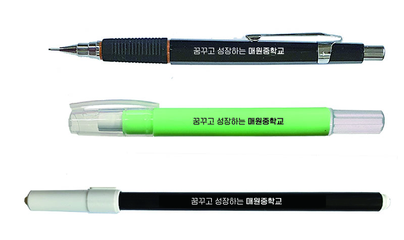 매원중학교 학사 행정 관리 물품 국산문구세트의 경우 일반 필기구와 마찬가지로 인쇄 영역 중 높이가 제한이 되어 있어 교표는 적용할 수가 없어 텍스트로만 시안을 드렸으며, 샤프와 싸인펜은 화이트 인쇄로 진행되며, 슬림 스틱지우개의 경우 화이트로 인쇄할 경우 가독성이 매우 떨어져 블랙컬러로 인쇄가 됩니다.