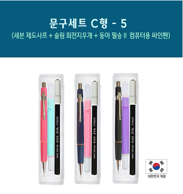 학사 행정 관리 물품 국산문구세트는 0.5mm 세븐제도샤프와 슬림회전지우개 그리고 동아 필승 컴퓨터용 싸인펜으로 구성되어 있으며, 세븐 제도샤프는 143mm, 슬림 회전지우개는 137mm, 동아 필승 컴퓨터용 싸인펜은 152mm 사이즈 이기 때문에 케이스는 163mm 사이즈로 제작이 되었습니다.
