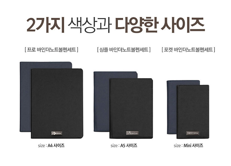 졸업 기념품 학사 행정 관리 물품 3종 포켓바인더 볼펜세트 색상과 사이즈는 A4사이즈, A5사이즈, 미니사이즈 총 3개의 사이즈로 제작이 가능하며, 네이비와 블랙 컬러 선택이 가능합니다.