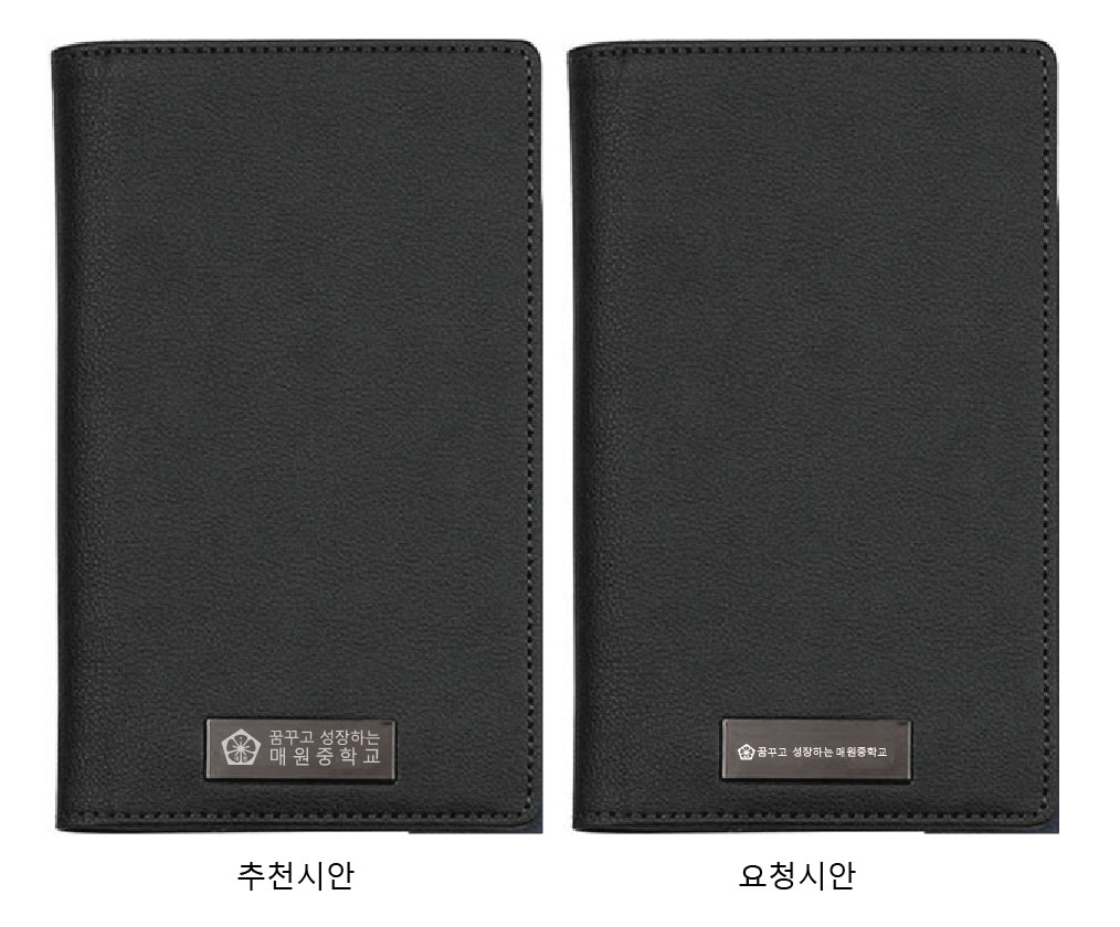 교표+꿈꾸고 성장하는 매원중학교로 인쇄를 요청하셔서 위와 같이 가로로 1단으로 인쇄할 경우 교표를 포함한 텍스트가 매우 작아져, 가독성이 떨어지므로, 왼쪽 추천시안 처럼 2단으로 텍스트를 배치하고 교표를 최대한 키운 시안을 드려서 바로 추천시안으로 확정이 되었습니다.