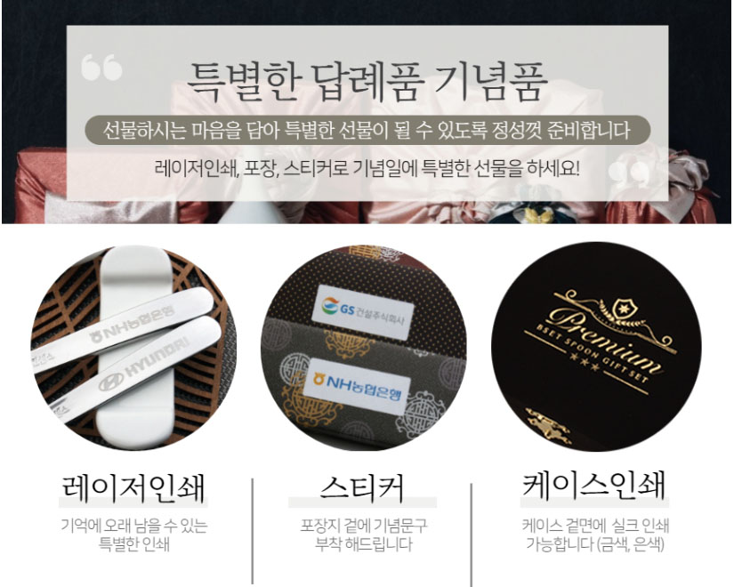특별한 마음을 담은 문구나 기업 단체 로고 등을 숟가락 뒷면에 영구적으로 레이저 각인이 가능하며, 섬세한 인쇄 가공으로 홍보물품으로도 활용하실 수 있습니다. 기본수량 20세트 이상일 경우 레이저 각인은 무료로 서비스 해드립니다.