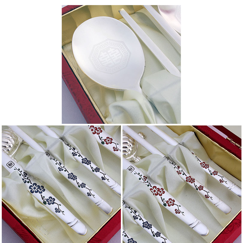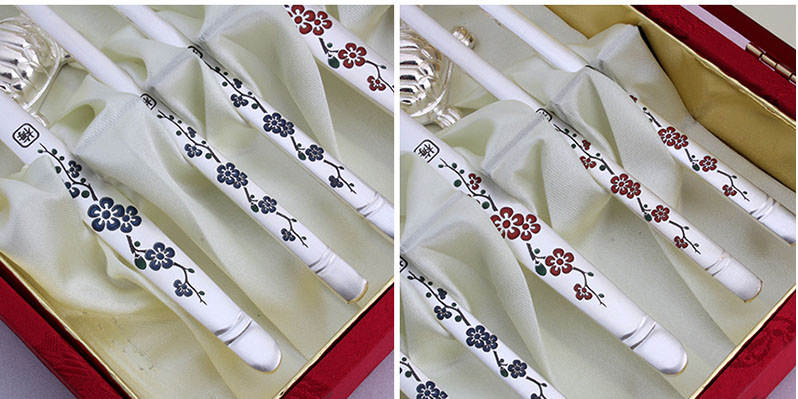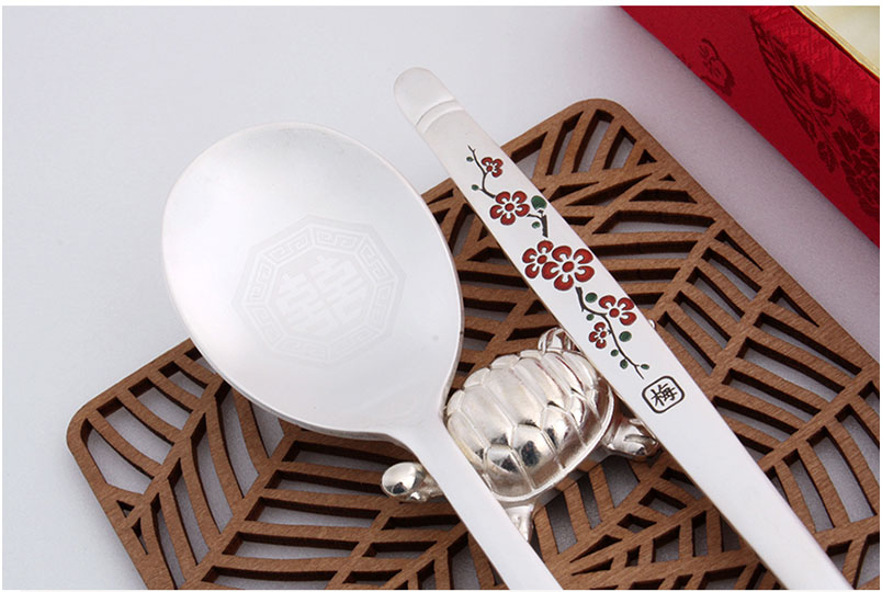 선물용 칠보 매화 은수저 2벌세트 숟가락 볼 중앙에 레이저로 전통 문양이 각인되어 있으며, 손잡이 부분은 전사 인쇄 처리로 청색과 홍색으로 구분이 가능하도록 화려한 문양이 적용되어 있습니다.