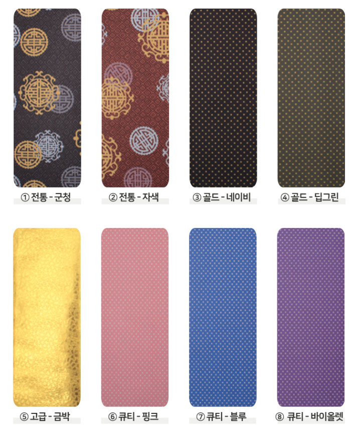 칠보 매화 은수저 2벌 선물세트는 받으시는 분의 또는 선물하시는 분의 취향에 따라 다양한 선물포장지, 전통문양 군청색, 전통문양 자색, 골드 네이비 혼합, 골드 딥그린 혼합, 고급 금박, 귀여운 핑크, 시원한 블루, 깔끔한 바이올렛의 총 8가지 포장지를 선택하실 수 있습니다.