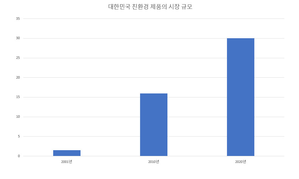- 환경 오염이 심각한 사회 문제로 떠오르면서 친환경 관련 소비시장의 규모가 급속도로 성장하고 있습니다. 한국소비자원에 따르면 2001년에는 1.5조원, 2010년에는 16조원, 2020년에는 30조 규모로 성장했습니다.