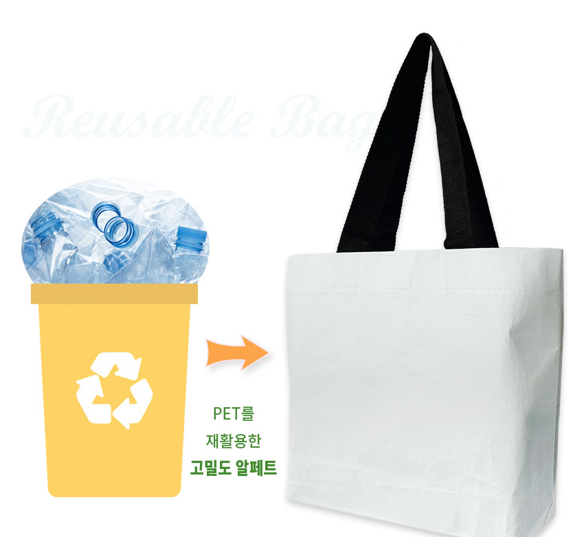 전 세계적으로 심각성이 대두되고 있는 폐플라스틱 패트병 PET병을 재활용한 고밀도 알페트 가방도 지속 가능한 친환경 마케팅 판촉 홍보물품으로 각광을 받고 있습니다.
