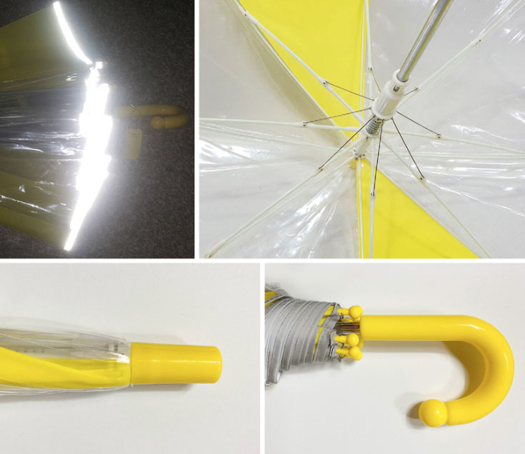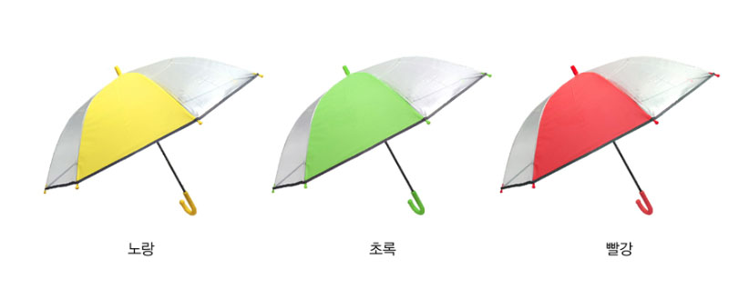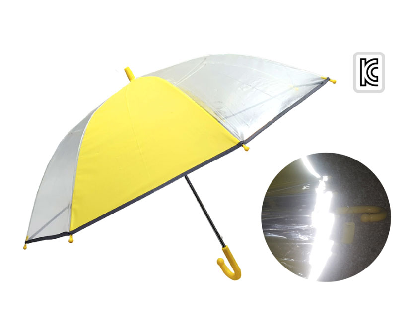 시야확보에 유리한 투명 반사띠 안전우산은 총 8개의 우산면 중 2개의 면에 시인성이 뛰어난 노란색, 초록색, 빨간색 원단을 사용했고, 나머지 6개면은 투명비닐로 제작되어 앞, 뒤, 옆 등 최대한의 시야각으로 시야를 확보해, 주변의 위험을 감지할 수 있도록 디자인 되었습니다.