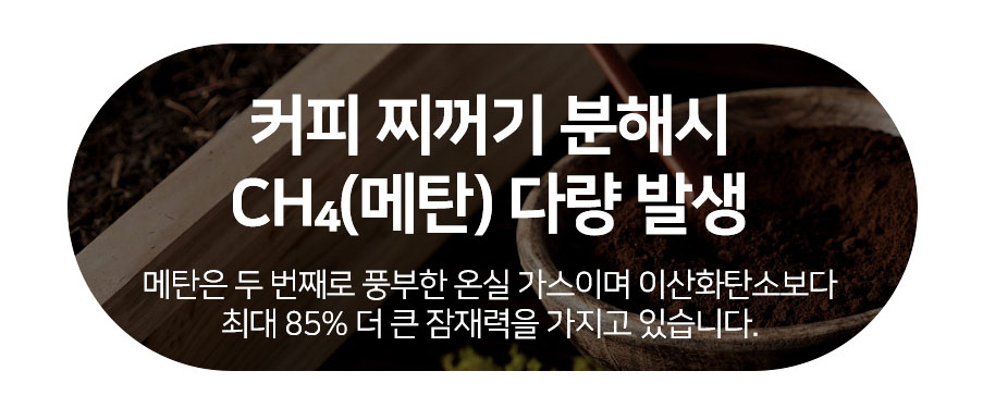 대한민국에서는 커피숍에서 하루에 약 145톤의 사용된 커피 찌꺼기가 발생하며, 가정에서는 연간 약 53,000톤의 커피 찌꺼기가 발생하는 것으로 추정됩니다. 대부분의 커피 찌꺼기는 분리 수거가 어렵고 퇴비 수요가 낮기 때문에 매립되거나 소각됩니다.